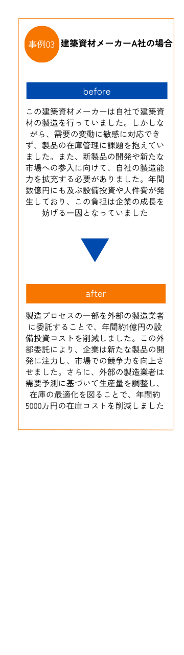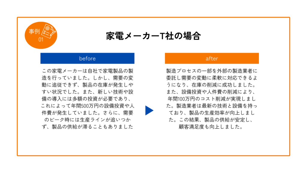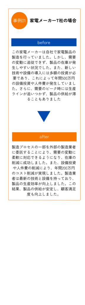 企業が製造を外部に委託することで、自社で設備を維持管理する必要がなくなり、設備の更新や修理にかかるコストを削減できます。これにより、企業は固定費を抑えつつ、効率的な製造プロセスを維持することができます